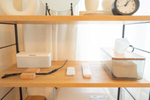 ハンガーラック(ハンガー5個)/ スリッパ(4セット) / 荷物カゴ / スマホ充電器(各種)/ Bluetoothスピーカー / ヒーリング音楽プレーヤー(自然音) / ヨガマット(2枚) / ハーフポール(2本) / ストレッチポール